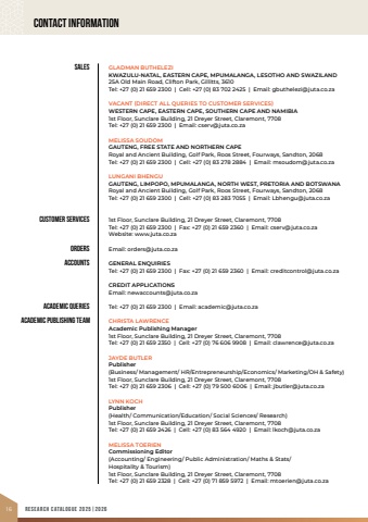 16 research CATALOGUE 2025|2026CONTACT INFORMATIONSALES GLADMAN BUTHELEZIKWAZULU-NATAL, EASTERN CAPE, MPUMALANGA, LESOTHO AND SWAZILAND25A Old Main Road, Clifton Park, Gillitts, 3610Tel: +27 (0) 21 659 2300 | Cell: +27 (0) 83 702 2425 | Email: gbuthelezi@juta.co.zaVACANT (DIRECT ALL QUERIES TO CUSTOMER SERVICES)WESTERN CAPE, EASTERN CAPE, SOUTHERN CAPE AND NAMIBIA1st Floor, Sunclare Building, 21 Dreyer Street, Claremont, 7708Tel: +27 (0) 21 659 2300 | Email: cserv@juta.co.zaMELISSA SOUDOMGAUTENG, FREE STATE AND NORTHERN CAPERoyal and Ancient Building, Golf Park, Roos Street, Fourways, Sandton, 2068 Tel: +27 (0) 21 659 2300 | Cell: +27 (0) 83 278 2884 | Email: msoudom@juta.co.zaLUNGANI BHENGUGAUTENG, LIMPOPO, MPUMALANGA, NORTH WEST, PRETORIA AND BOTSWANARoyal and Ancient Building, Golf Park, Roos Street, Fourways, Sandton, 2068 Tel: +27 (0) 21 659 2300 | Cell: +27 (0) 83 283 7055 | Email: Lbhengu@juta.co.zaCUSTOMER SERVICES 1st Floor, Sunclare Building, 21 Dreyer Street, Claremont, 7708Tel: +27 (0) 21 659 2300 | Fax: +27 (0) 21 659 2360 | Email: cserv@juta.co.za Website: www.juta.co.zaORDERS Email: orders@juta.co.zaACCOUNTS GENERAL ENQUIRIESTel: +27 (0) 21 659 2300 | Fax: +27 (0) 21 659 2360 | Email: creditcontrol@juta.co.za CREDIT APPLICATIONS Email: newaccounts@juta.co.zaACADEMIC QUERIES Tel: +27 (0) 21 659 2300 | Email: academic@juta.co.za ACADEMIC PUBLISHING TEAM CHRISTA LAWRENCEAcademic Publishing Manager1st Floor, Sunclare Building, 21 Dreyer Street, Claremont, 7708 Tel: +27 (0) 21 659 2350 | Cell: +27 (0) 76 606 9908 | Email: clawrence@juta.co.zaJAYDE BUTLERPublisher (Business/ Management/ HR/Entrepreneurship/Economics/ Marketing/OH & Safety)1st Floor, Sunclare Building, 21 Dreyer Street, Claremont, 7708 Tel: +27 (0) 21 659 2306 | Cell: +27 (0) 79 500 6006 | Email: jbutler@juta.co.zaLYNN KOCHPublisher (Health/ Communication/Education/ Social Sciences/ Research)1st Floor, Sunclare Building, 21 Dreyer Street, Claremont, 7708 Tel: +27 (0) 21 659 2426 | Cell: +27 (0) 83 564 4920 | Email: lkoch@juta.co.zaMELISSA TOERIENCommissioning Editor (Accounting/ Engineering/ Public Administration/ Maths & Stats/Hospitality & Tourism)1st Floor, Sunclare Building, 21 Dreyer Street, Claremont, 7708 Tel: +27 (0) 21 659 2328 | Cell: +27 (0) 71 859 5972 | Email: mtoerien@juta.co.za