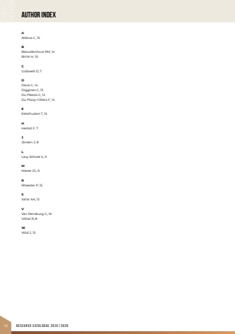 18 research CATALOGUE 2025|2026AAldous C, 15BBezuidenhout RM, 14Brink H, 10CColdwell D, 7DDavis C, 14Diggines C, 13Du Plessis C, 12Du Plooy-Cilliers F, 14EEsterhuizen T, 15HHerbst F, 7JJansen J, 8LLevy Sithole S, 11MMaree JG, 9RRheeder P, 15SSatar AA, 12VVan Rensburg G, 10Vithal R, 8WWiid J, 13AUTHOR INDEX