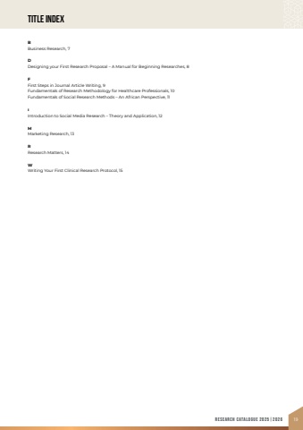 research CATALOGUE 2025|2026 19BBusiness Research, 7 DDesigning your First Research Proposal %u2013 A Manual for Beginning Researches, 8FFirst Steps in Journal Article Writing, 9Fundamentals of Research Methodology for Healthcare Professionals, 10Fundamentals of Social Research Methods %u2013 An African Perspective, 11IIntroduction to Social Media Research %u2013 Theory and Application, 12MMarketing Research, 13RResearch Matters, 14WWriting Your First Clinical Research Protocol, 15TITLE INDEX