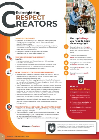 #RespectCreatorsWHAT IS COPYRIGHT?%u2022 Copyright, or authors%u2019 right, is a legal term used to describe the rights that creators have in their literary, artistic and scientific literary works. %u2022 Works covered range from books, music, paintings, sculpture, and films to computer programs, databases, advertisements, maps, and technical drawings. %u2022 Copyright is owned for a fixed number of years. %u2022 Copyright may be assigned to a publisher.WHAT STEPS CAN BE TAKEN AGAINST INFRINGERS?%u2022 Publishers and authors have the right to take the necessary action against copyright infringers.%u2022 The Copyright Act makes provision for criminal penalties %u2013 a fine (a maximum of R5 000 per infringement) and/or imprisonmentup to three years for a first conviction. %u2022 Copyright infringers can also be held accountable for damages.WHY IS COPYRIGHT IMPORTANT?Copyright:%u2022 Promotes creativity and the development of knowledge. %u2022 Serves the public interest. %u2022 Allows copyright owners to earn an income from their work.%u2022 Protects the value of an author%u2019s work by prohibiting the unlawful or non-authorised use of the work.HOW TO AVOID COPYRIGHT INFRINGMENT?%u2022 Material that is subject to copyright protection may not, without the permission of the copyright holder, be downloaded from websites, shared, distributed or sold.%u2022 Avoid groups that share copyrighted works illegally. This happens, for example, on WhatsApp, Telegram, Dropbox or Google Drive, even though these platforms are legal.%u2022 There are exceptions and limitations to copyright owners%u2019 exclusive rights. Instances in which restrictions to reproduction do not apply are when the work is used for research or personal use, as part of studies, or for non-commercial use in education and in libraries. Use for criticism or review or for new reporting is also exempted.%u2022 With all these exceptions noted above, the source must be mentioned, as well as the name(s) of the author(s). Copyright infringement is illegal %u2013 you reap where you have not sown. Both the author and publisher suffer losses through copyright infringements. How to do the right thing1. Respect the creator%u2019s rights.2. Allow the creator to earn an income and support further creativity.3. If required, get permission to use copyright material.4. Resist illegal online materials.5. Report infringements to the publisher. The top 5 thingsyou need to know about copyrightCopyright describes the rights that creators have in their literary, artistic and scientific literaryworks.Copyright infringement is illegal and can result in criminal penalties, including imprisonment.Copyright allows owners to earn an income from their work.Copyright protects the value of creators%u2019 work.Copyright serves the public interest.RESPECT CREATORSS A Y N O TO I L L E G A L C O P Y I N G12543RESPECT CREATORS Making illegal copies of this publication, distributing them unlawfully or sharing them on social media without the written permission of the publisher may lead to civil claims or criminal complaints. Protect the communities who are sustained by creativity.S A Y N O TO I L L E G A L C O P Y I N G4 research CATALOGUE 2025|2026