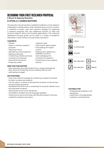 8 research CATALOGUE 2025|2026SUITABLE FOR%u2022 Postgraduate students in all disciplines%u2022 Supervisors of postgraduate students in all disciplinesDesigning your First Research Proposal A Manual for Beginning ResearchersR VITHAL & J JANSEN (EDITORS)This popular manual has been updated to address current research challenges in all disciplines, while maintaining its succinct content. It presents a simple, clear and coherent strategy for preparing a research proposal with two additional sections to take into account research ethics and funding applications. This practical, application-focused guide can be used in a variety of academic disciplines in both tertiary and secondary education.2nd EDITION 2019 Ed64 PAGES978 1 48512 990 5 ZAR R221.00978 1 48512 991 2 ZAR R208.00NEW FOR THIS EDITION%u2022 New examples and case studies from a range of disciplines%u2022 New sections: Protecting human subjects (ethics) and estimating a budget.KEY FEATURES%u2022 Clear and coherent strategy for preparing a research proposal for basic to advanced research%u2022 Can be used in a variety of educational contexts in both tertiary and secondary education%u2022 Workbook format for use in workshops for doctoral, Master%u2019s and baccalaureate students%u2022 Appropriate across many disciplines%u2022 Accessible to English second-language speakers%u2022 Interactive structure promotes self-directed research training %u2013 suitable for distance education.CONTENTS%u2022 Preface %u2022 Steps in writing a research proposal%u2022 Selecting a focus%u2022 Identifying critical questions%u2022 Stating a rationale%u2022 Conducting a literature review%u2022 Locating a conceptual/theoretical framework%u2022 Preparing a data collection plan%u2022 Planning for data analysis%u2022 Anticipating the report outline%u2022 Dealing with validity and reliability concerns%u2022 Acknowledging the limitations of research%u2022 Protecting human subjects (ethics)e e-BOOK